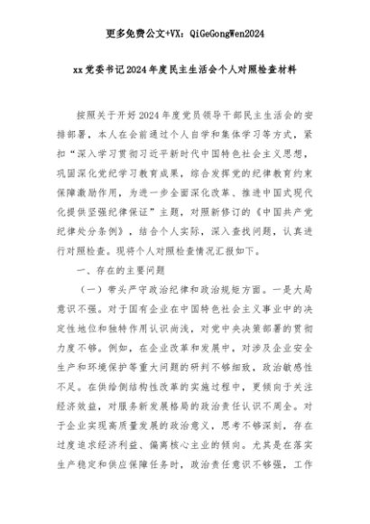 【七哥公文】2025年:xx党委书记2024年度民主生活会个人对照检查材料+更多免费公文+VX:QiGeGongWen2024+更多免费公文+VX:QiGeGongWen2024