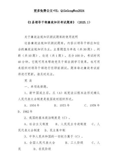 【七哥公文】2025年:《X县领导干部廉政知识考试题库》(2025.1)+更多免费公文+VX:QiGeGongWen2024+更多免费公文+VX:QiGeGongWen2024