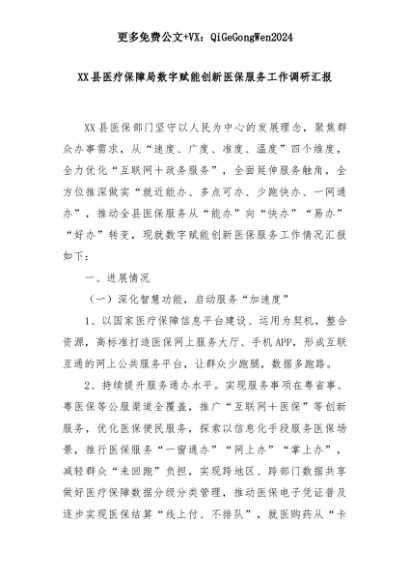 【七哥公文】2025年:XX县医疗保障局数字赋能创新医保服务工作调研汇报+更多免费公文+VX:QiGeGongWen2024+更多免费公文+VX:QiGeGongWen2024