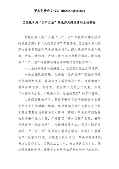 【七哥公文】2025年:X区粮食局“三严三治”深化作风建设活动总结报告+更多免费公文+VX:QiGeGongWen2024+更多免费公文+VX:QiGeGongWen2024