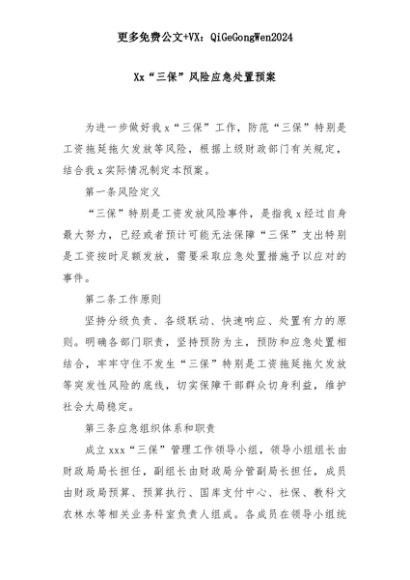 【七哥公文】2025年:Xx“三保”风险应急处置预案+更多免费公文+VX:QiGeGongWen2024+更多免费公文+VX:QiGeGongWen2024