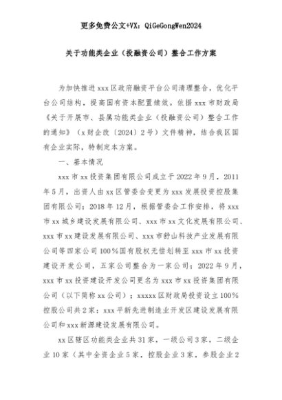 【七哥公文】2025年:关于功能类企业(投融资公司)整合工作方案+更多免费公文+VX:QiGeGongWen2024+更多免费公文+VX:QiGeGongWen2024