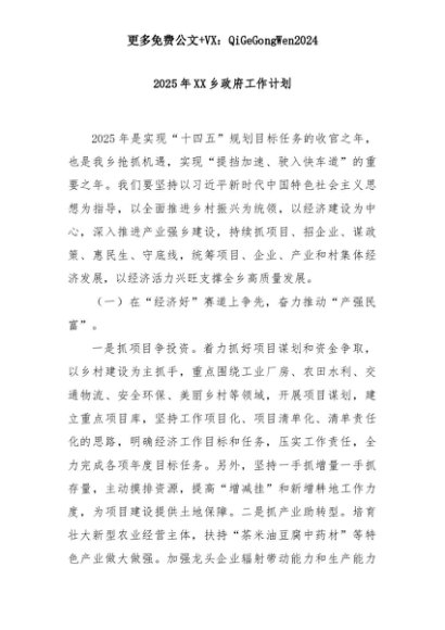 【七哥公文】2025年:2025年XX乡政府工作计划+更多免费公文+VX:QiGeGongWen2024+更多免费公文+VX:QiGeGongWen2024