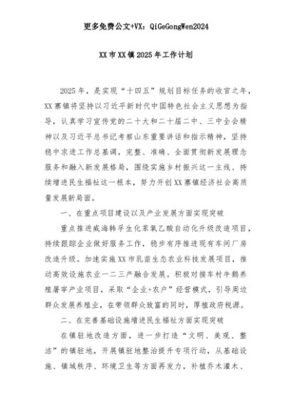 【七哥公文】2025年:XX市XX镇2025年工作计划+更多免费公文+VX:QiGeGongWen2024+更多免费公文+VX:QiGeGongWen2024