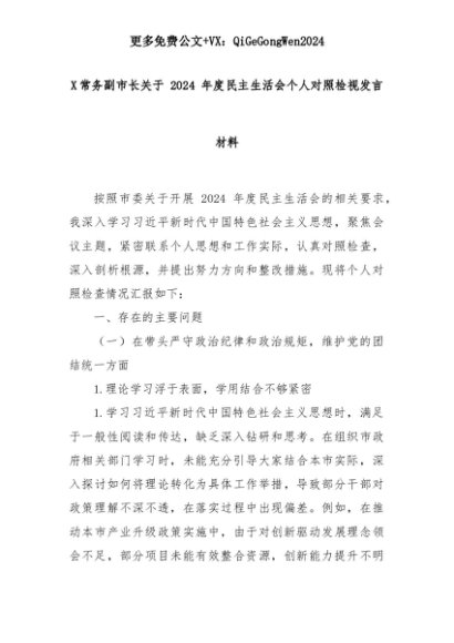 【七哥公文】2025年:X常务副市长关于 2024 年度民主生活会个人对照检视发言材料+更多免费公文+VX:QiGeGongWen2024+更多免费公文+VX:QiGeGongWen2024