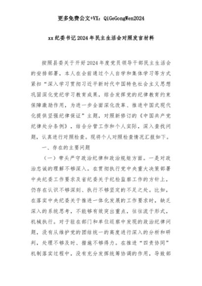 【七哥公文】2025年:xx纪委书记2024年民主生活会对照发言材料+更多免费公文+VX:QiGeGongWen2024+更多免费公文+VX:QiGeGongWen2024