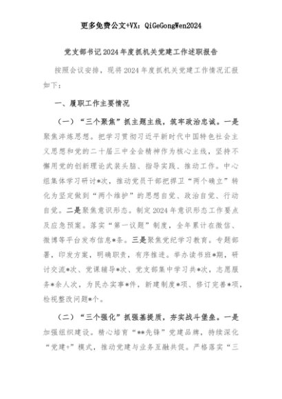 【七哥公文】2025年:党支部书记2024年度抓机关党建工作述职报告+更多免费公文+VX:QiGeGongWen2024+更多免费公文+VX:QiGeGongWen2024