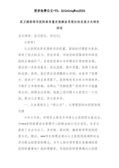 【七哥公文】2025年:某卫健委领导医院高质量发展解放思想加快发展方式转变讲话+更多免费公文+VX:QiGeGongWen2024+更多免费公文+VX:QiGeGongWen2024