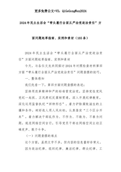 【七哥公文】2025年:(165条)2024年民主生活会“带头履行全面从严治党政治责任”方面问题起草指南、实例和素材+更多免费公文+VX:QiGeGongWen2024+更多免费公文+VX:QiGeGongWen2024