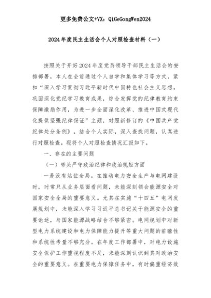 【七哥公文】2025年:2024年度民主生活会个人对照检查材料(一)+更多免费公文+VX:QiGeGongWen2024+更多免费公文+VX:QiGeGongWen2024