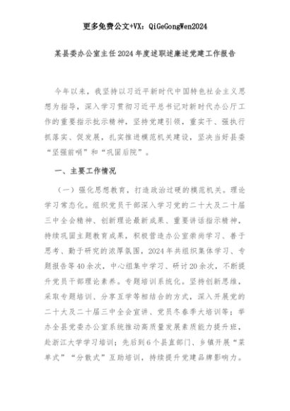 【七哥公文】2025年:某县委办公室主任2024年度述职述廉述党建工作报告+更多免费公文+VX:QiGeGongWen2024+更多免费公文+VX:QiGeGongWen2024