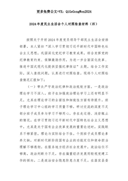 【七哥公文】2025年:2024年度民主生活会个人对照检查材料(四)+更多免费公文+VX:QiGeGongWen2024+更多免费公文+VX:QiGeGongWen2024