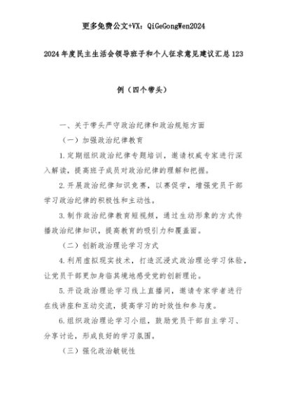 【七哥公文】2025年:2024年度民主生活会领导班子和个人征求意见建议汇总123例(四个带头)+更多免费公文+VX:QiGeGongWen2024+更多免费公文+VX:QiGeGongWen2024