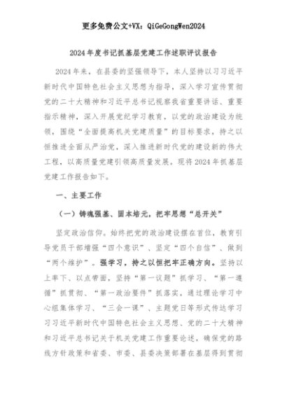 【七哥公文】2025年:2024年度书记抓基层党建工作述职评议报告+更多免费公文+VX:QiGeGongWen2024+更多免费公文+VX:QiGeGongWen2024
