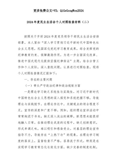 【七哥公文】2025年:2024年度民主生活会个人对照检查材料(二)+更多免费公文+VX:QiGeGongWen2024+更多免费公文+VX:QiGeGongWen2024