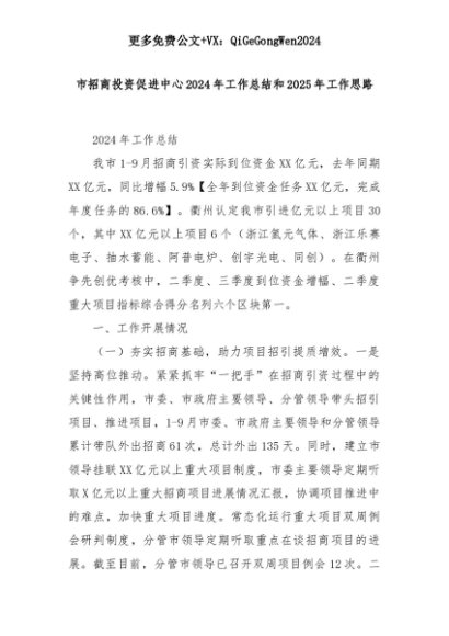【七哥公文】2025年:市招商投资促进中心2024年工作总结和2025年工作思路+更多免费公文+VX:QiGeGongWen2024+更多免费公文+VX:QiGeGongWen2024