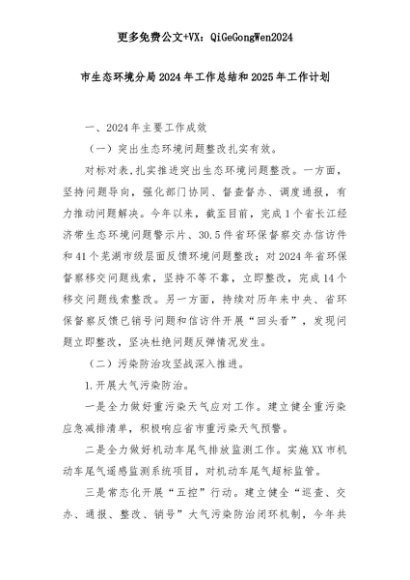 【七哥公文】2025年:市生态环境分局2024年工作总结和2025年工作计划+更多免费公文+VX:QiGeGongWen2024+更多免费公文+VX:QiGeGongWen2024