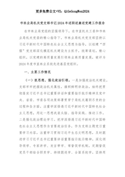 【七哥公文】2025年:市林业局机关党支部书记2024年述职述廉述党建工作报告+更多免费公文+VX:QiGeGongWen2024+更多免费公文+VX:QiGeGongWen2024