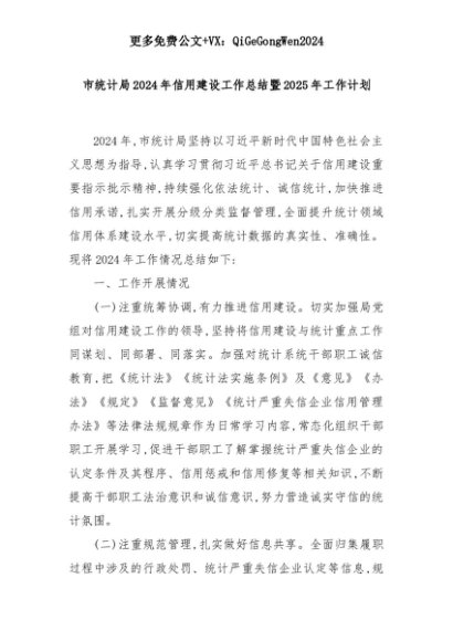 【七哥公文】2025年:市统计局2024年信用建设工作总结暨2025年工作计划+更多免费公文+VX:QiGeGongWen2024+更多免费公文+VX:QiGeGongWen2024