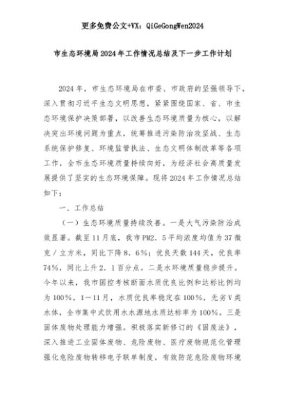 【七哥公文】2025年:市生态环境局2024年工作情况总结及下一步工作计划+更多免费公文+VX:QiGeGongWen2024+更多免费公文+VX:QiGeGongWen2024