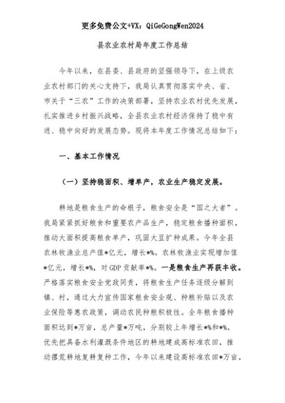 【七哥公文】2025年:县农业农村局年度工作总结+更多免费公文+VX:QiGeGongWen2024+更多免费公文+VX:QiGeGongWen2024