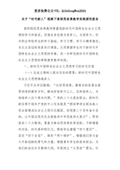 【七哥公文】2025年:关于“时代新人”视阈下高职思政课教学实践探究报告+更多免费公文+VX:QiGeGongWen2024+更多免费公文+VX:QiGeGongWen2024