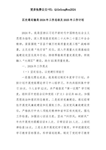 【七哥公文】2025年:区交通运输局2024年工作总结及2025年工作计划+更多免费公文+VX:QiGeGongWen2024+更多免费公文+VX:QiGeGongWen2024