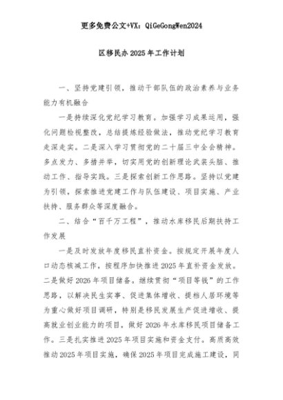 【七哥公文】2025年:区移民办2025年工作计划+更多免费公文+VX:QiGeGongWen2024+更多免费公文+VX:QiGeGongWen2024