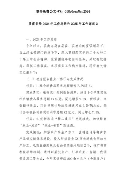 【七哥公文】2025年:县商务局2024年工作总结和2025年工作谋划2+更多免费公文+VX:QiGeGongWen2024+更多免费公文+VX:QiGeGongWen2024