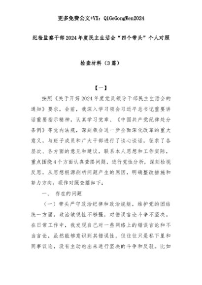 【七哥公文】2025年:(3篇)(纪检监察干部 2024 年度民主生活会“四个带头”个人对照检查材料+更多免费公文+VX:QiGeGongWen2024+更多免费公文+VX:QiGeGongWen2024