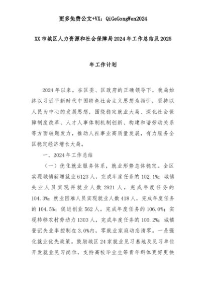 【七哥公文】2025年:XX市城区人力资源和社会保障局2024年工作总结及2025年工作计划+更多免费公文+VX:QiGeGongWen2024+更多免费公文+VX:QiGeGongWen2024