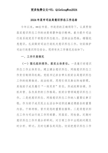 【七哥公文】2025年:2024年某市司法局意识形态工作总结+更多免费公文+VX:QiGeGongWen2024+更多免费公文+VX:QiGeGongWen2024