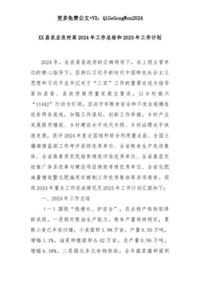 【七哥公文】2025年:XX县农业农村局2024年工作总结和2025年工作计划+更多免费公文+VX:QiGeGongWen2024+更多免费公文+VX:QiGeGongWen2024