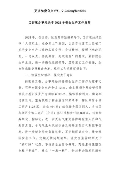 【七哥公文】2025年:X街道办事处关于2024年安全生产工作总结+更多免费公文+VX:QiGeGongWen2024+更多免费公文+VX:QiGeGongWen2024