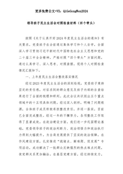 【七哥公文】2025年:领导班子民主生活会对照检查材料(四个带头)+更多免费公文+VX:QiGeGongWen2024+更多免费公文+VX:QiGeGongWen2024