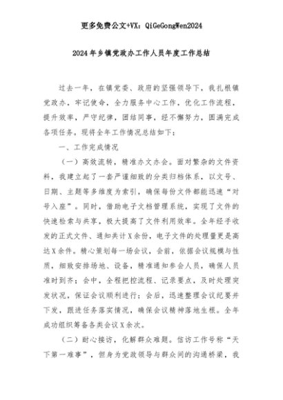 【七哥公文】2025年:2024年乡镇党政办工作人员年度工作总结+更多免费公文+VX:QiGeGongWen2024+更多免费公文+VX:QiGeGongWen2024