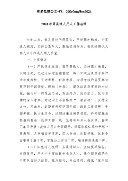 【七哥公文】2025年:2024年某县选人用人工作总结+更多免费公文+VX:QiGeGongWen2024+更多免费公文+VX:QiGeGongWen2024