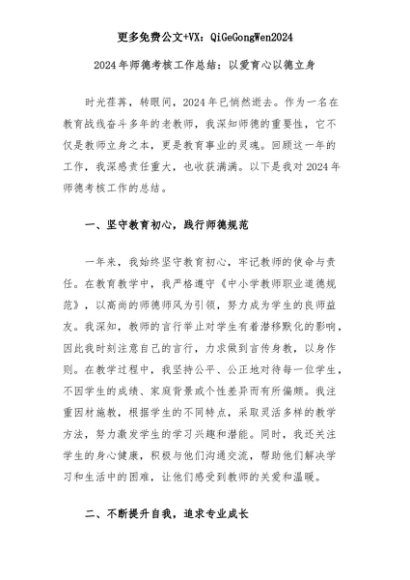 【七哥公文】2025年:2024年师德考核工作总结:以爱育心以德立身+更多免费公文+VX:QiGeGongWen2024+更多免费公文+VX:QiGeGongWen2024