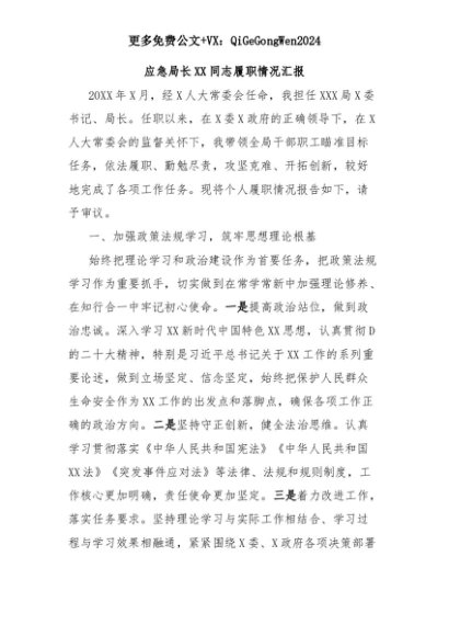 【七哥公文】2025年:应急局长XX同志履职情况汇报+更多免费公文+VX:QiGeGongWen2024+更多免费公文+VX:QiGeGongWen2024