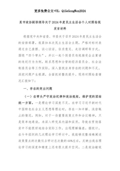 【七哥公文】2025年:某市政协副职领导关于2024年度民主生活会个人对照检视发言材料+更多免费公文+VX:QiGeGongWen2024+更多免费公文+VX:QiGeGongWen2024