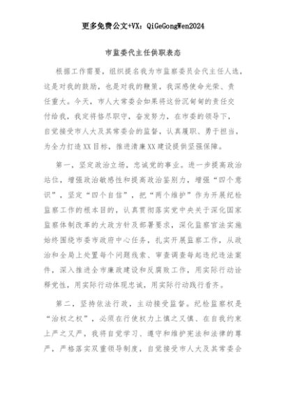 【七哥公文】2025年:市监委代主任供职表态+更多免费公文+VX:QiGeGongWen2024+更多免费公文+VX:QiGeGongWen2024