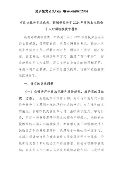 【七哥公文】2025年:市政协机关党组成员、副秘书长关于2024年度民主生活会个人对照检视发言材料+更多免费公文+VX:QiGeGongWen2024+更多免费公文+VX:QiGeGongWen2024