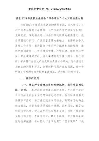 【七哥公文】2025年:县长2024年度民主生活会“四个带头”个人对照检查材料+更多免费公文+VX:QiGeGongWen2024+更多免费公文+VX:QiGeGongWen2024