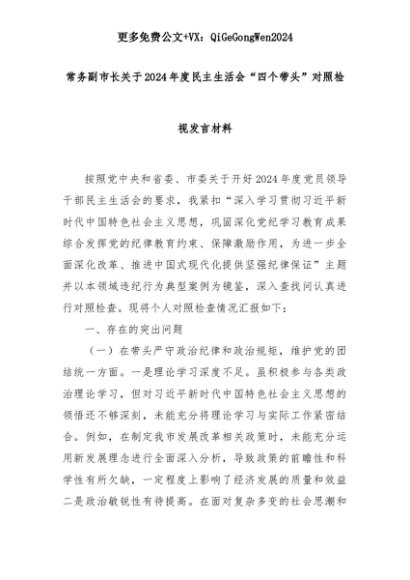 【七哥公文】2025年:常务副市长关于2024年度民主生活会“四个带头”对照检视发言材料+更多免费公文+VX:QiGeGongWen2024+更多免费公文+VX:QiGeGongWen2024