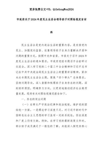 【七哥公文】2025年:市政府关于2024年度民主生活会领导班子对照检视发言材料+更多免费公文+VX:QiGeGongWen2024+更多免费公文+VX:QiGeGongWen2024