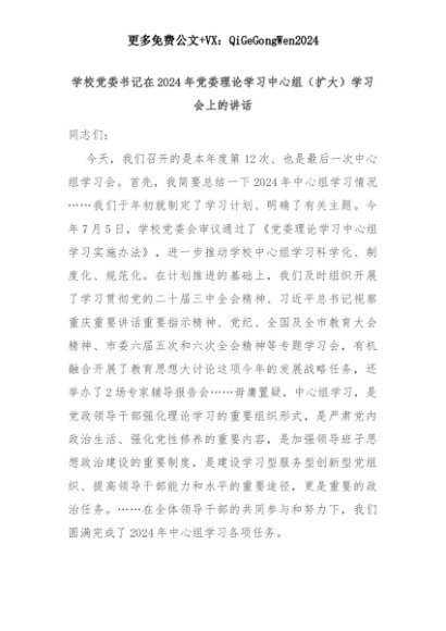 【七哥公文】2025年:学校党委书记在2024年党委理论学习中心组(扩大)学习会上的讲话+更多免费公文+VX:QiGeGongWen2024+更多免费公文+VX:QiGeGongWen2024