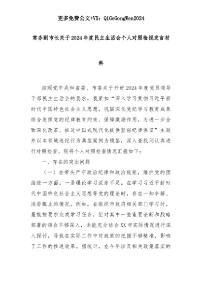 【七哥公文】2025年:常务副市长关于2024年度民主生活会个人对照检视发言材料+更多免费公文+VX:QiGeGongWen2024+更多免费公文+VX:QiGeGongWen2024