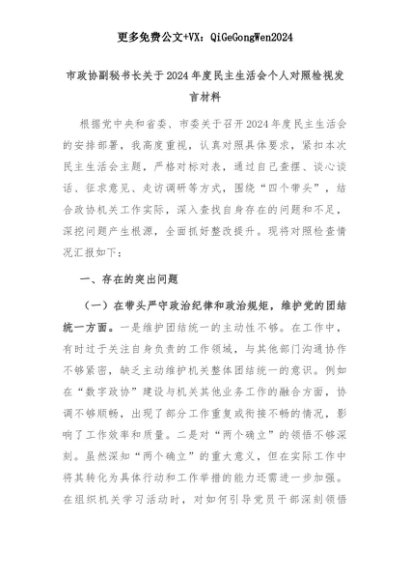 【七哥公文】2025年:市政协副秘书长关于2024年度民主生活会个人对照检视发言材料+更多免费公文+VX:QiGeGongWen2024+更多免费公文+VX:QiGeGongWen2024