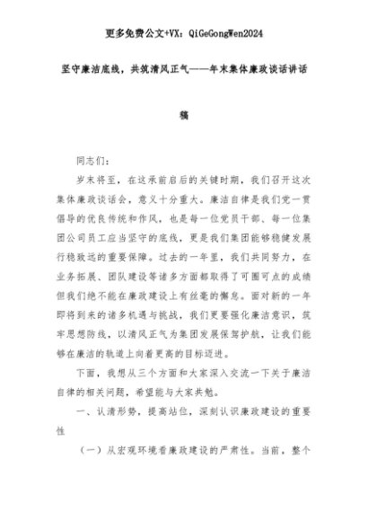 【七哥公文】2025年:坚守廉洁底线,共筑清风正气——年末集体廉政谈话讲话稿+更多免费公文+VX:QiGeGongWen2024+更多免费公文+VX:QiGeGongWen2024