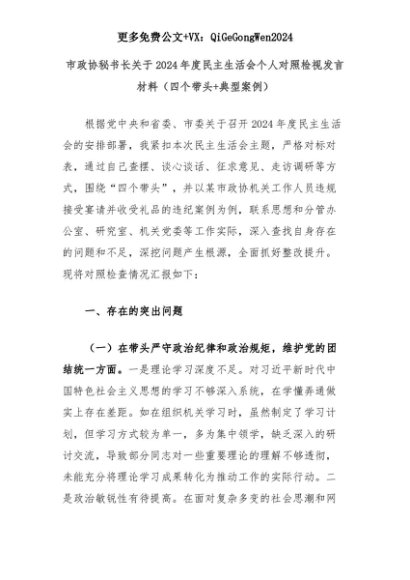 【七哥公文】2025年:市政协秘书长关于2024年度民主生活会个人对照检视发言材料(四个带头+典型案例)+更多免费公文+VX:QiGeGongWen2024+更多免费公文+VX:QiGeGongWen2024